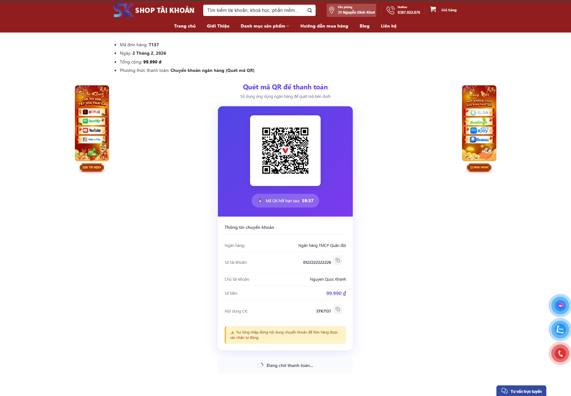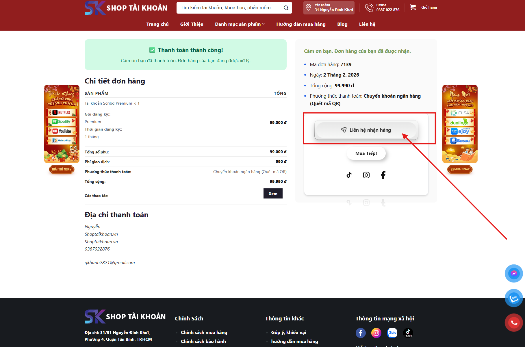 Bước 3: Thực hiện thanh toán đơn hàng tại shop tài khoản