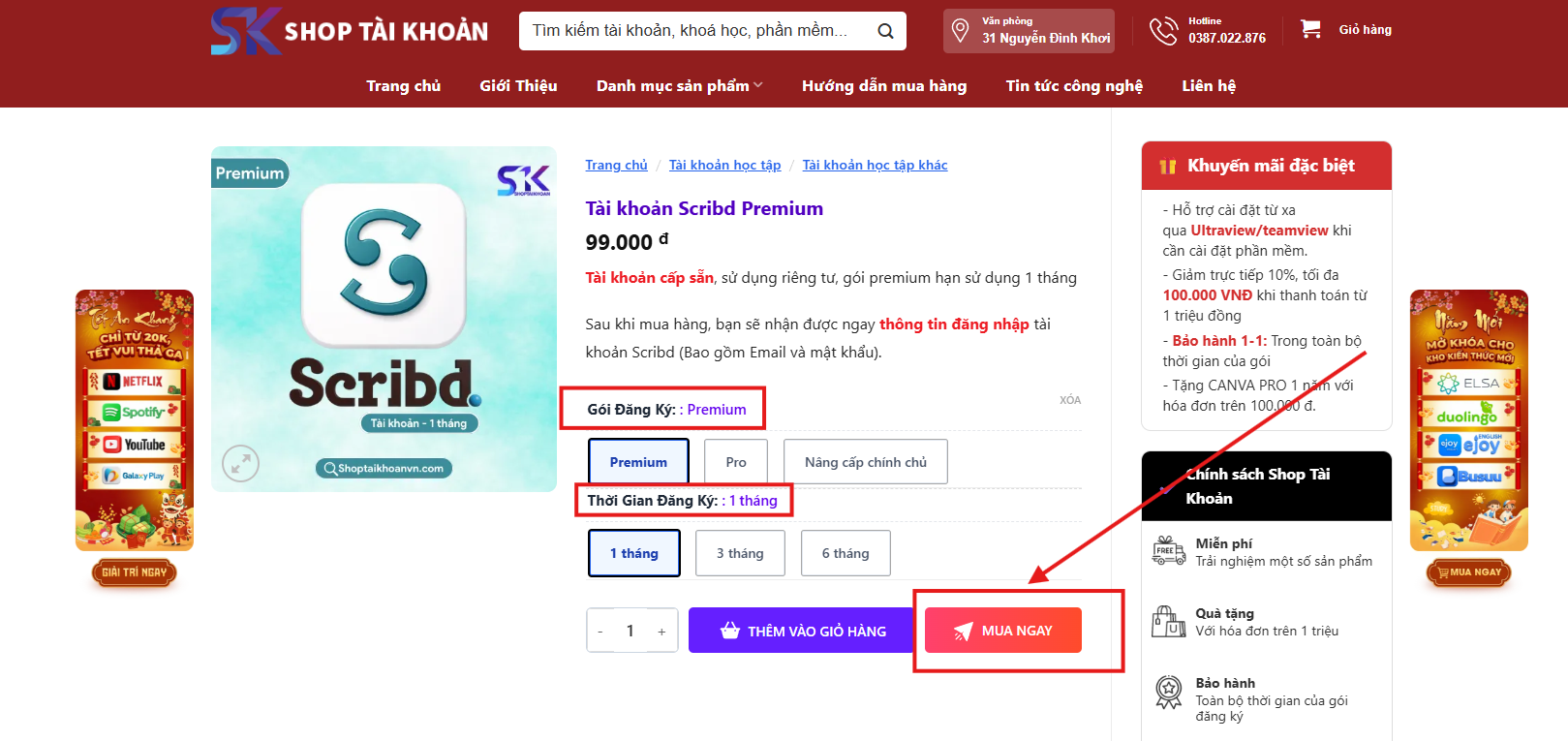 Chọn “ Gói đăng kí ” và chọn “Thời gian đăng ký” sau đó nhấn Mua Ngay hoặc Thêm vào giỏ nếu muốn mua thêm nhiều sản phẩm khác