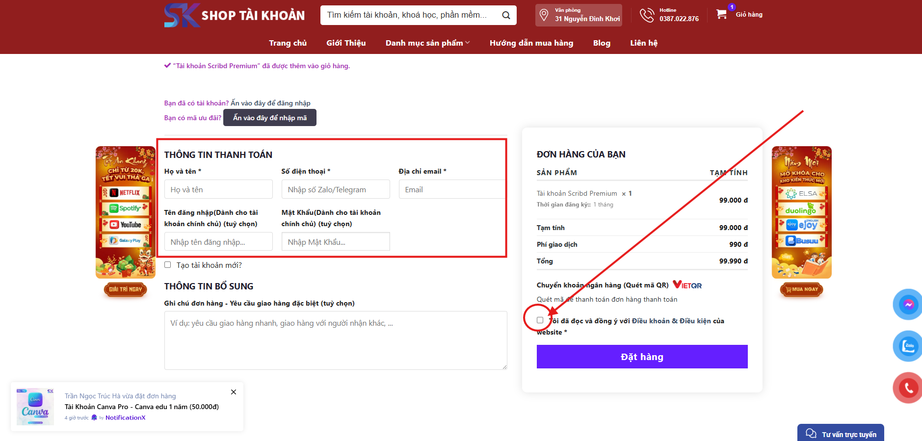 Để thanh toán đặt hàng, bạn hãy tick vào ô “Tôi đã đọc và đồng ý với Điều khoản & Điều kiện của website”